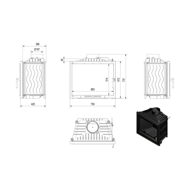 Klasiska kamīna kurtuve ar labiek tehniskiem parametriem.
